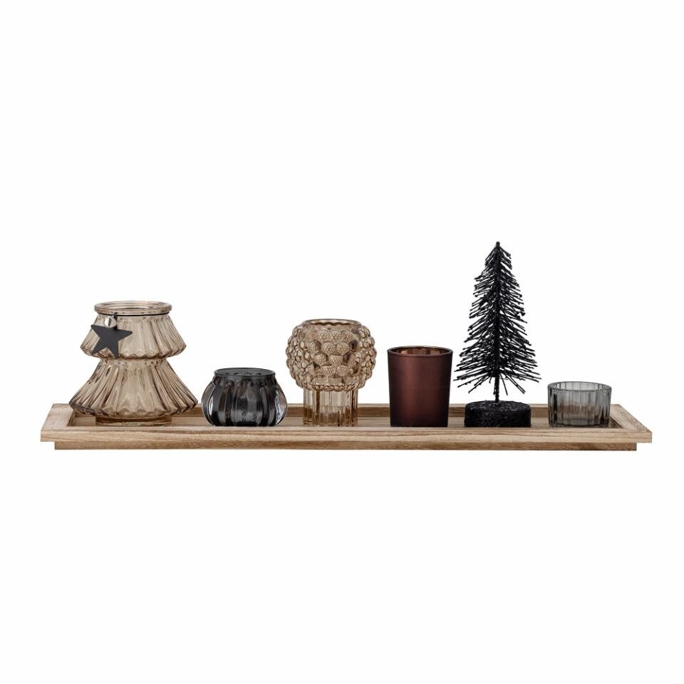 Deze leuke set bestaande uit een houten plateau en 5 glazen kaarshouders/vaasjes , met kerstboompje kan je gebruiken als decoratie, of om een gezellige atmospheer te creeëren.